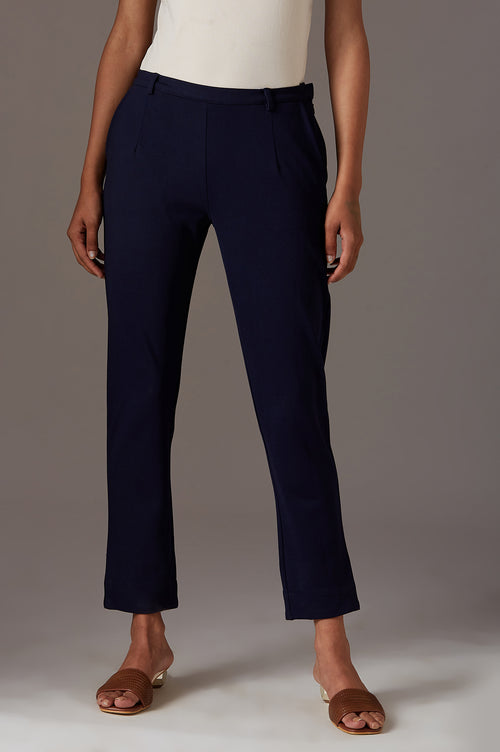Beige slim pants in mid-rise with partially elasticated waistband and side zipper.