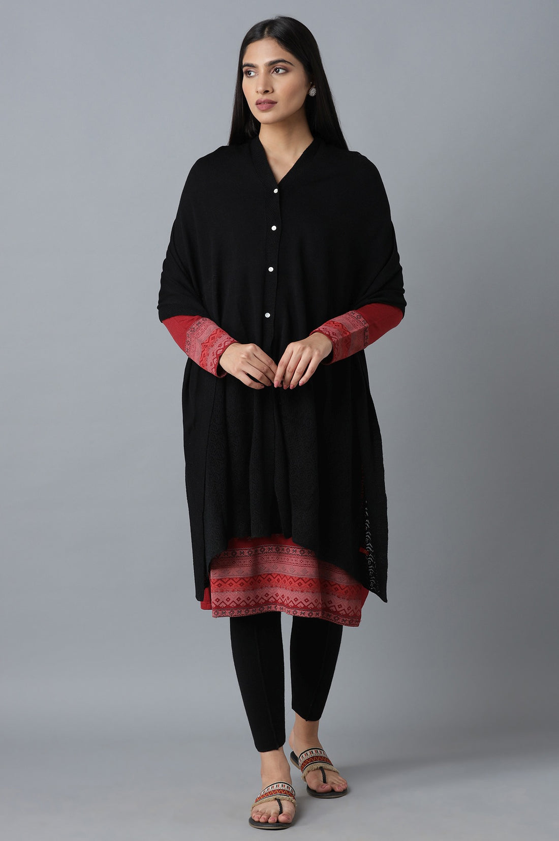This poncho will look stunning when paired with top and denim or a kurta set. Give your attire a finishing touch with rose tinted cheeks and flats.