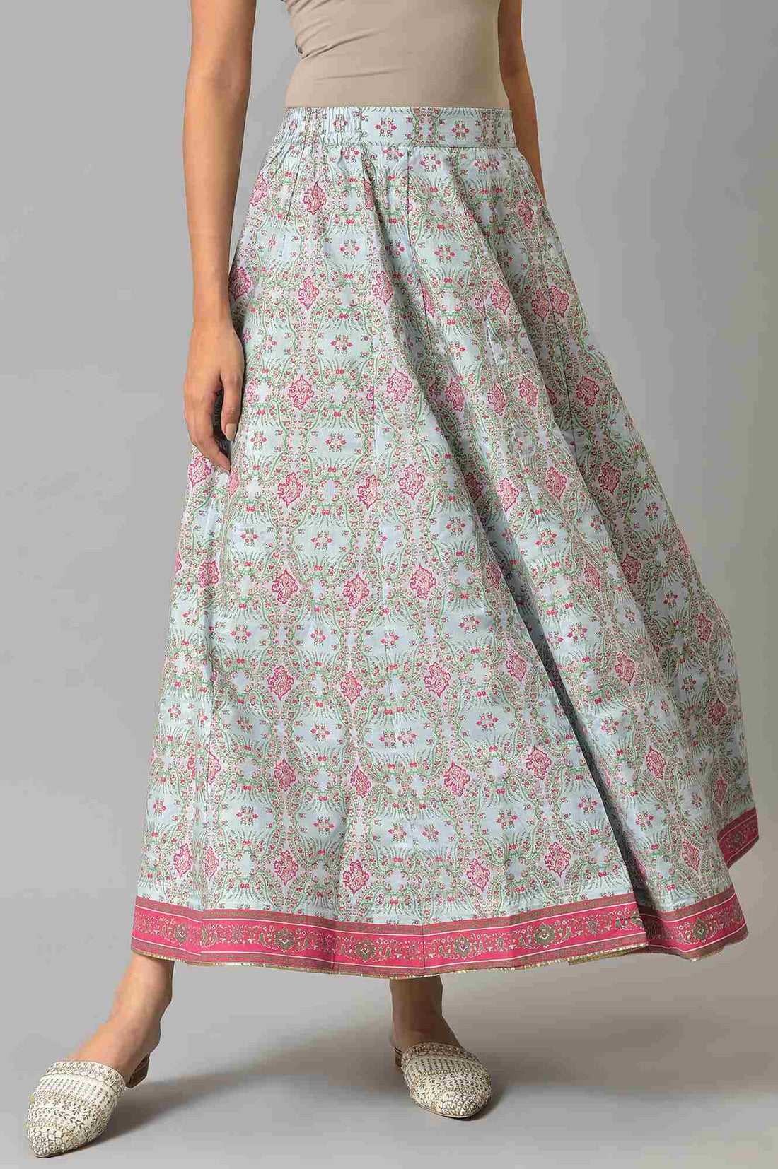 Skylight Blue And Multi-Colured Glitter Printed Skirt With Lurex Piping At Hemline.
