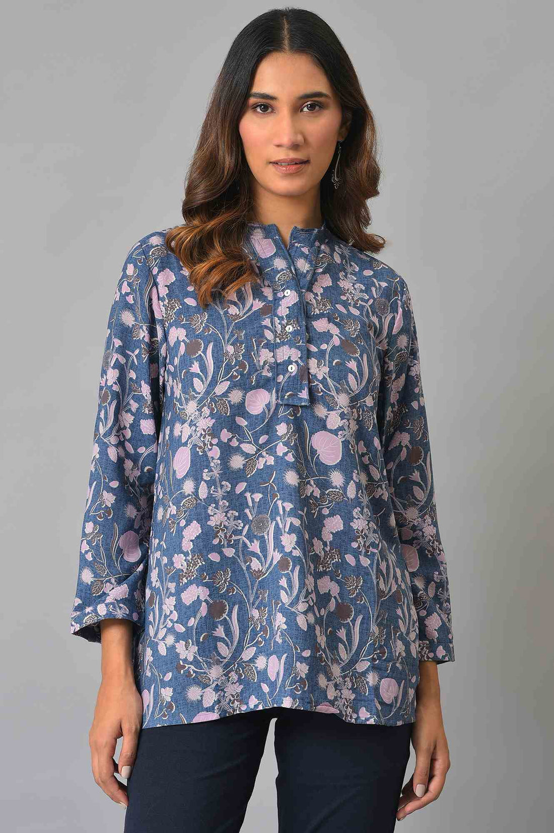 Stylish Blue Floral Top In Elegant Look! Give Your Wardrobe A Feminine Flair By Adding This Western Straight Silhouette Top. This Top-Wear Article Is Made To Give Comfort Fit And It Is High On Style. It Has Mandarin Collar With Button Closure And Three-Quarter Sleeves.