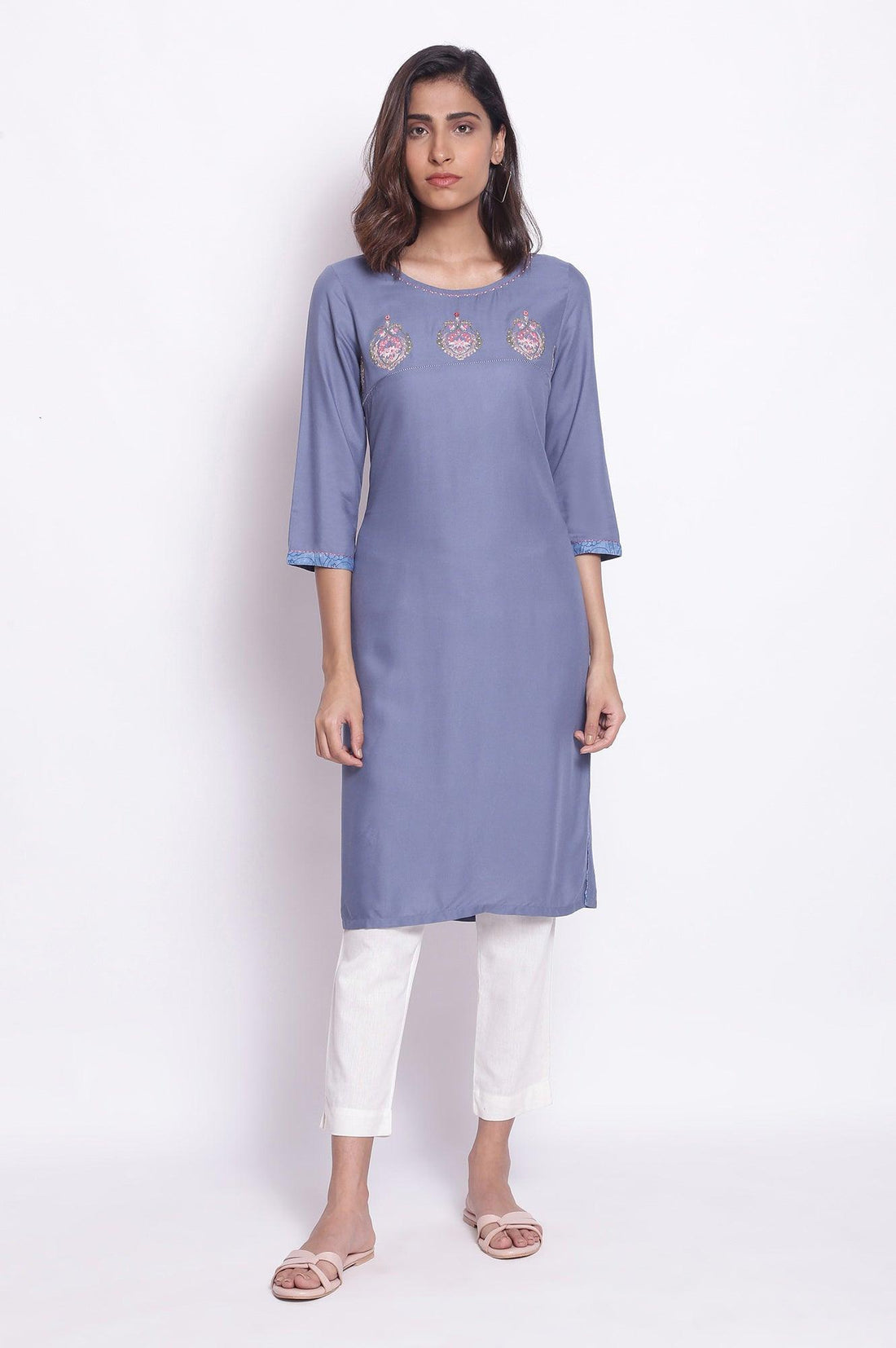 Embrace casual elegance with this stunning blue embroidered kurta. Crafted from 100% viscose using a woven construction technique, this ethnic piece offers unparalleled comfort and breathability. The straight silhouette flatters various body types, while the three-quarter sleeves provide a perfect balance between style and functionality. The round neckline adds a classic touch to the overall design. The intricate embroidery work showcases the skilled craftsmanship, making this kurta a true work of art. Perfect for casual outings or relaxed gatherings, this kurta effortlessly combines traditional aesthetics with contemporary fashion, allowing you to express your personal style with grace and confidence. It's the perfect blend for an Indo-western outfit. Pair it with stylish sandals, and you're ready to step out in effortless elegance.