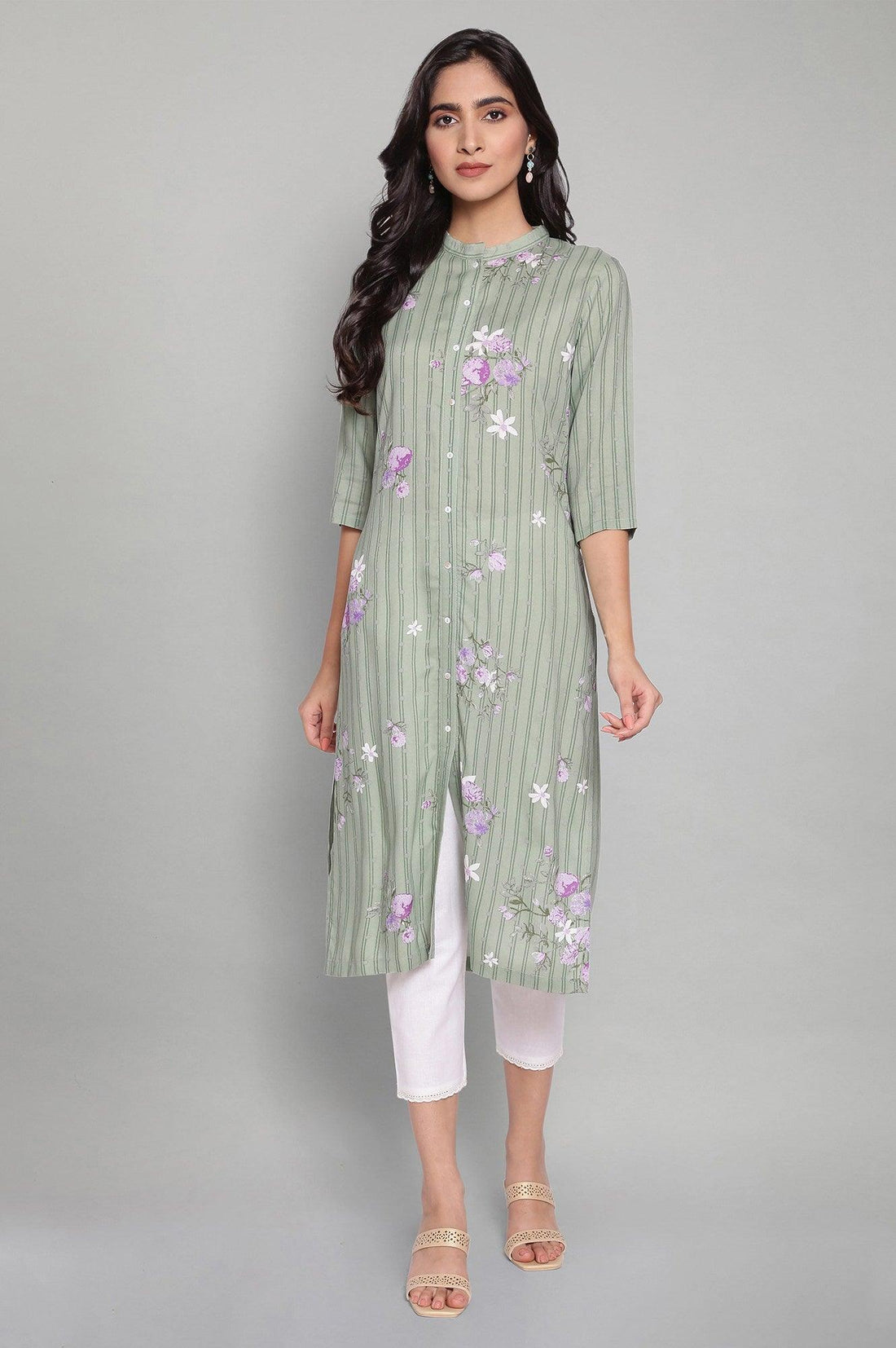 Embrace casual elegance with this green viscose kurta. Made from 100% viscose, this ethnic piece offers comfort and style for everyday wear. The kurta features a beautiful floral print, adding a touch of nature-inspired charm to your look. The band neckline provides a unique and stylish element, while the three-quarter sleeves offer versatility for different seasons. The woven construction technique ensures a comfortable fit and longevity. The straight silhouette of the kurta creates a sleek and modern appearance, suitable for various body types and occasions. This casual ethnic wear seamlessly blends traditional design with contemporary aesthetics, making it a perfect choice for both daily wear and informal gatherings.