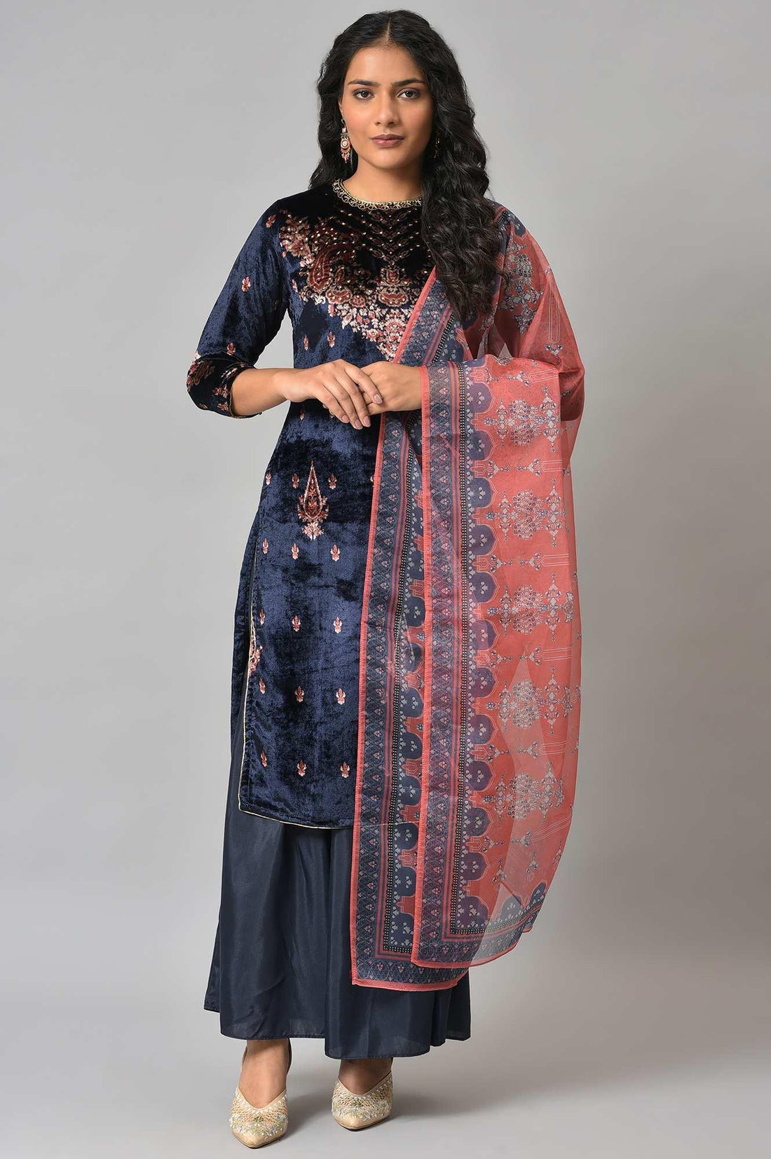 Get Get For The Wedding Season With This Amazing Heavy Festive kurta And Sharara Set. This Beautiful And Chic Set Includes Dark Blue Floral Printed Velvet kurta, Embellished With Sequins. It Is Coordinated With Shatung Gathered Sharara And Coral Coloured Organza Dupatta.