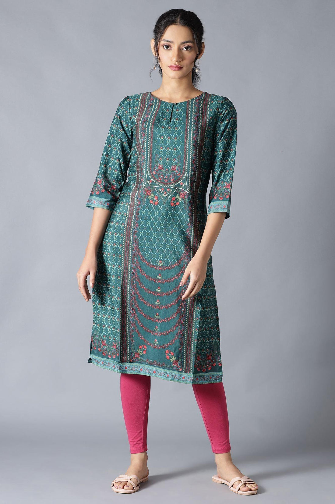 Amp Up Your Styling Game With This Dark Green Straight Fit kurta. Crafted In Crepe Fabric, The Piece Has Multicoloured Floral Print All Over. It Also Features Keyhole Neckline With Button Closure And Three-Quarter Sleeves.
