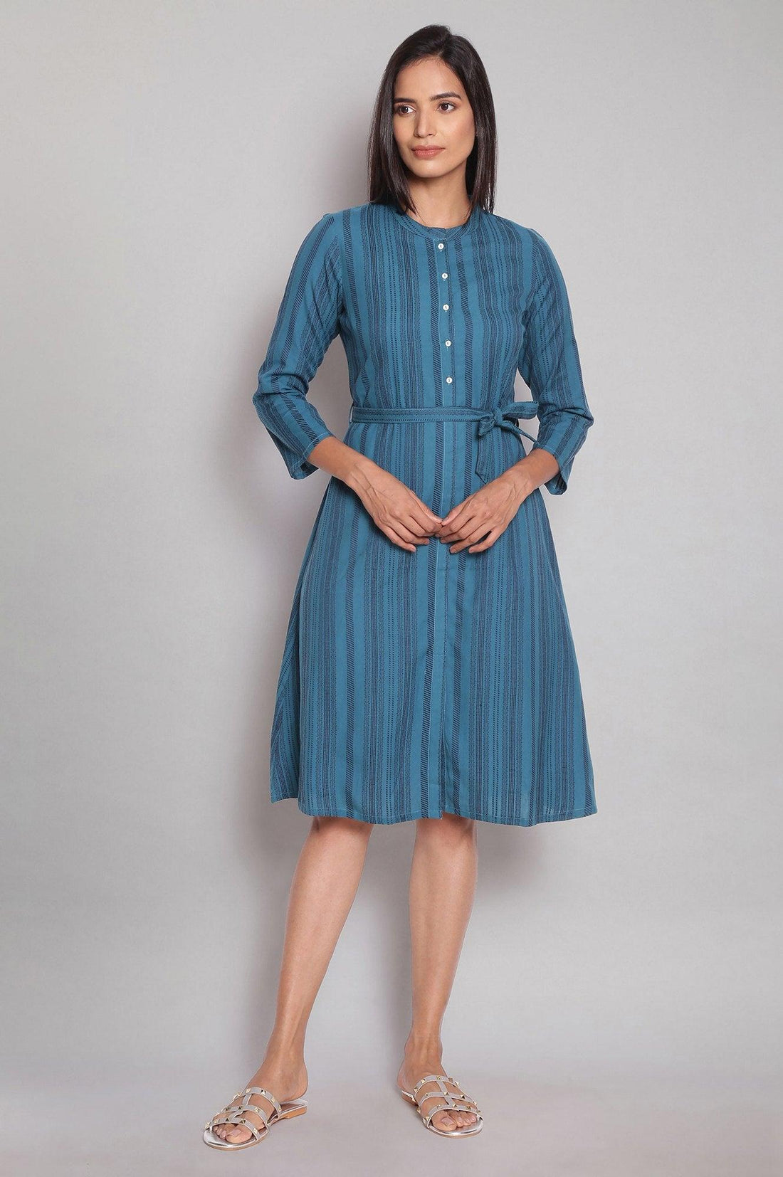 Dark teal stripe print shirt dress with belt in mandarin collar and three-quarter sleeves.