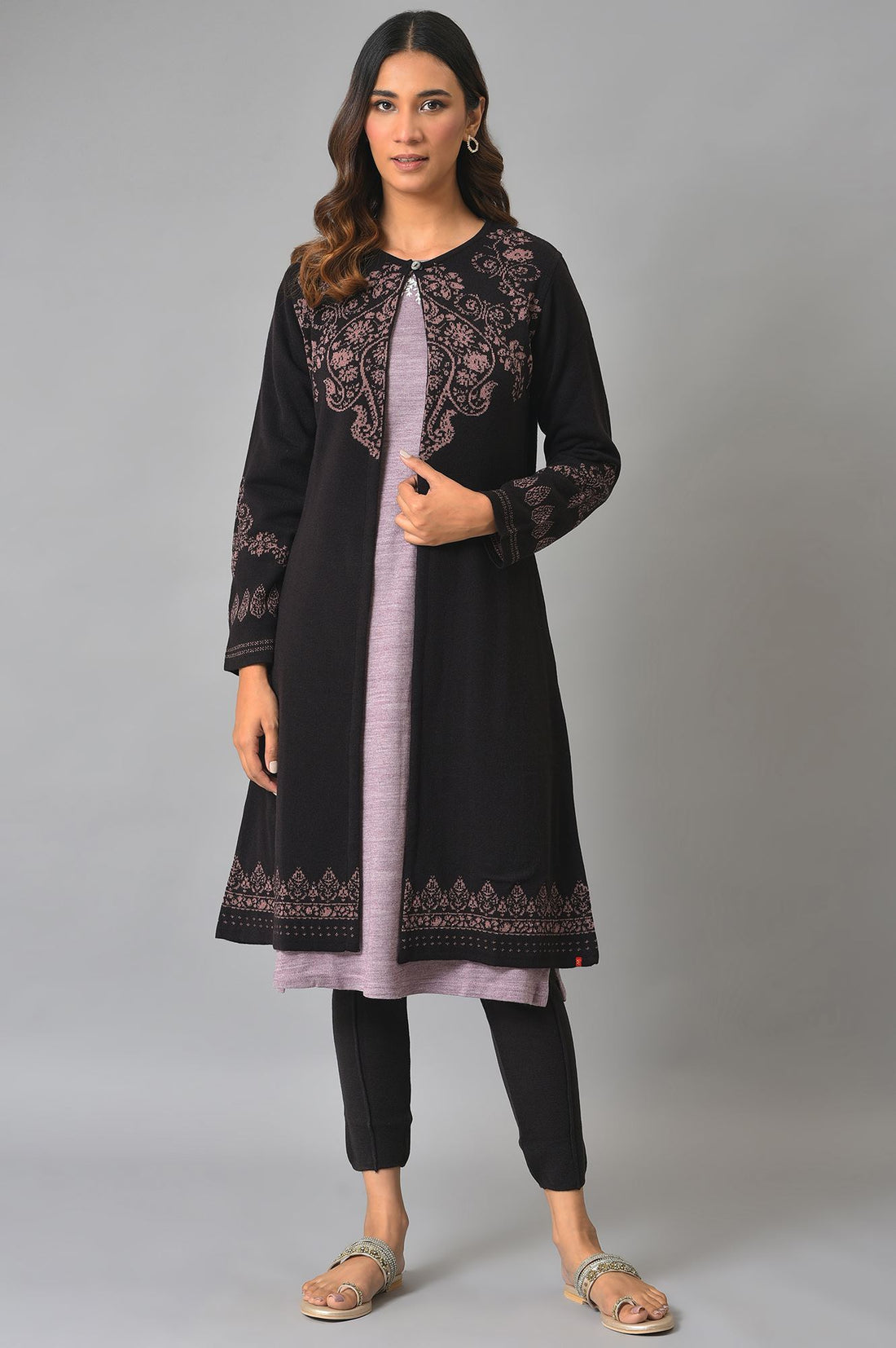 Deep Brown Front Open Reversible Jacquard Lurex Cardigan With Intricate Placement Design