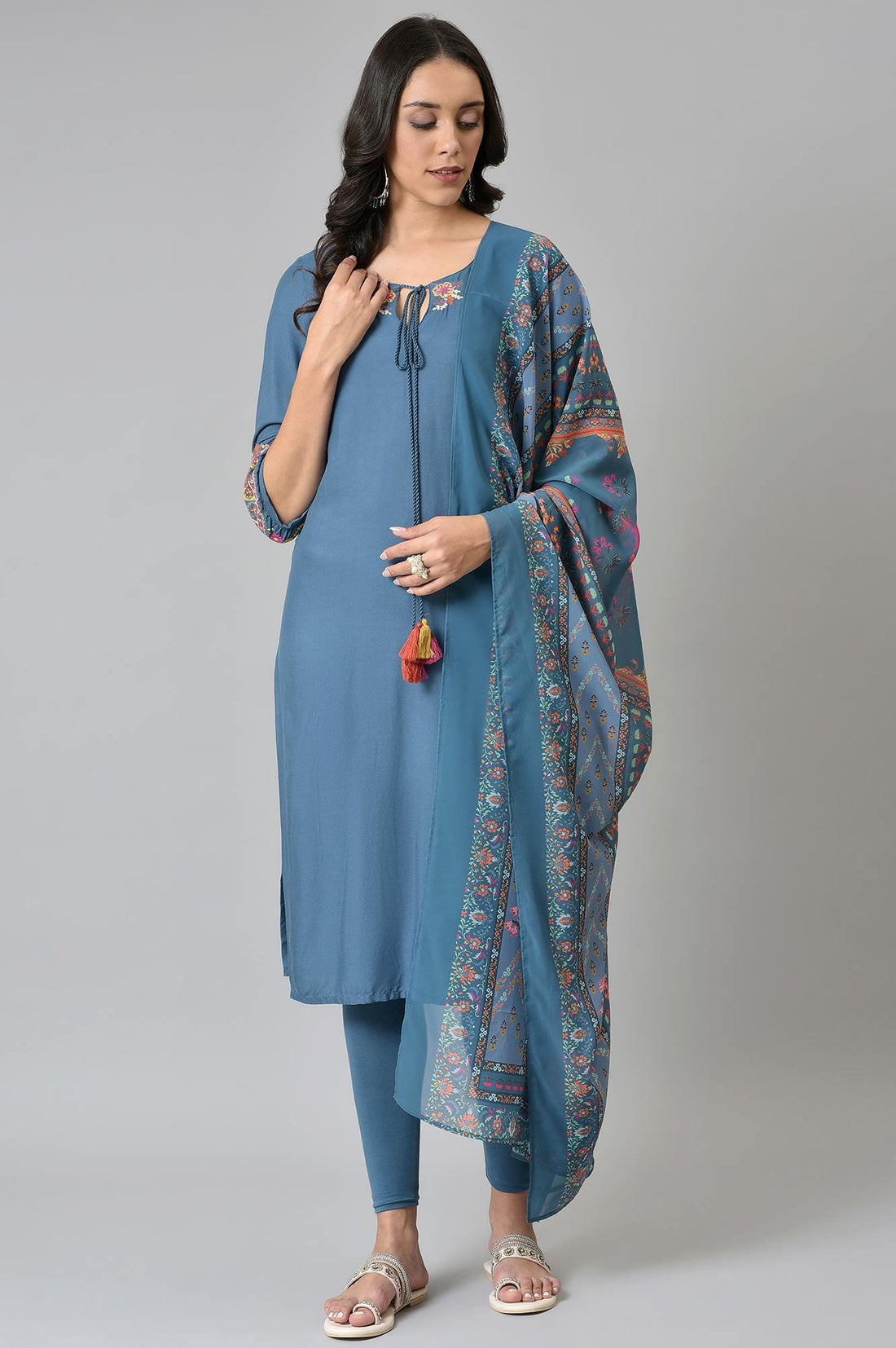 Experience the perfect blend of comfort and style with this ethnic kurta and tight set. Crafted from 100% viscose, this woven ensemble offers a luxurious feel against your skin. The kurta features elegant embroidery and a trendy tie-up neckline, adding a touch of sophistication to your casual wardrobe. The three-quarter sleeves provide versatility for various occasions and weather conditions. The blue hue of this outfit exudes a calm and serene vibe, making it an ideal choice for relaxed outings. The straight silhouette of the kurta ensures a flattering fit for all body types. Made from rayon, this outfit offers excellent breathability and drape, keeping you comfortable throughout the day. Whether you're heading to a casual gathering or running errands, this ethnic ensemble will keep you looking effortlessly stylish.