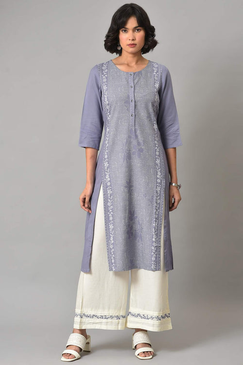 Get The Trendy And Elegant Look In This Dusky Purple kurta And Ecru Pants Set. The kurta Has Round Neckline With Button Closure And Front Slits. It Is Coordinated With Ecru Parallel Pants Having Thread Embroidery On Hemline. The Set Also Includes Printed Voile Dupatta.