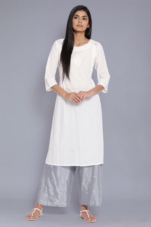 Ecru all-over print placement flared kurta in round neck and with embroidered yoke and sleeves.