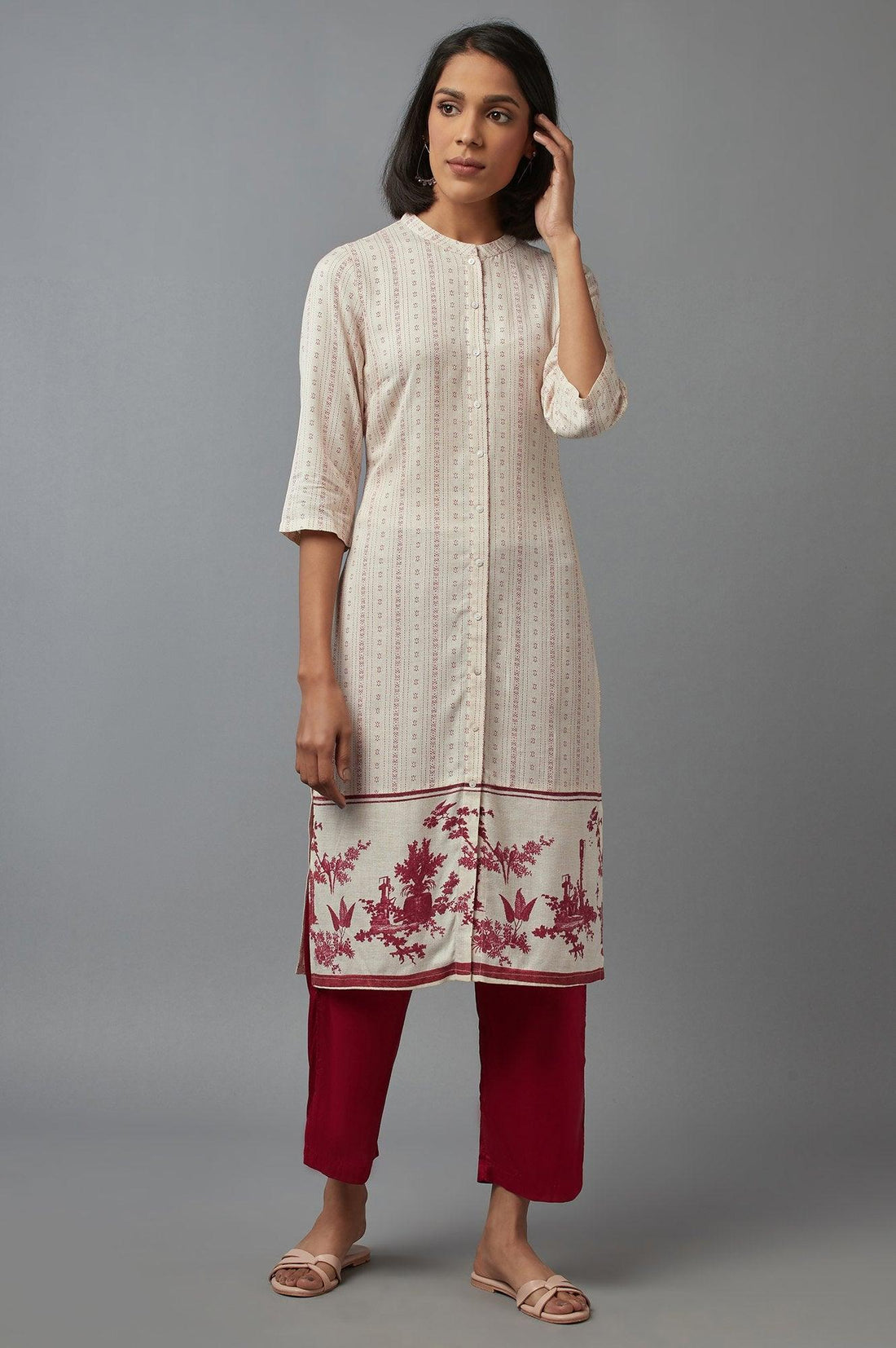 Discover effortless style with this off-white kurta, perfect for casual occasions. Featuring a unique blend of 88% rayon and 12% flax, this kurta offers a luxurious feel with a touch of natural texture. The three-quarter sleeves provide versatility for various weather conditions, while the band neckline adds a contemporary twist to the traditional design. Adorned with a delicate floral print, this straight-cut kurta exudes feminine charm and elegance. The woven construction ensures durability and a flattering drape that complements your silhouette. The flax component in the fabric adds a subtle texture and enhances breathability, making it comfortable for all-day wear. This ethnic-inspired piece seamlessly blends modern aesthetics with traditional elements, making it a versatile addition to your wardrobe. Whether paired with leggings, palazzos, or your favorite jeans, this off-white floral printed kurta is sure to become a go-to choice for your casual outings and relaxed gatherings.