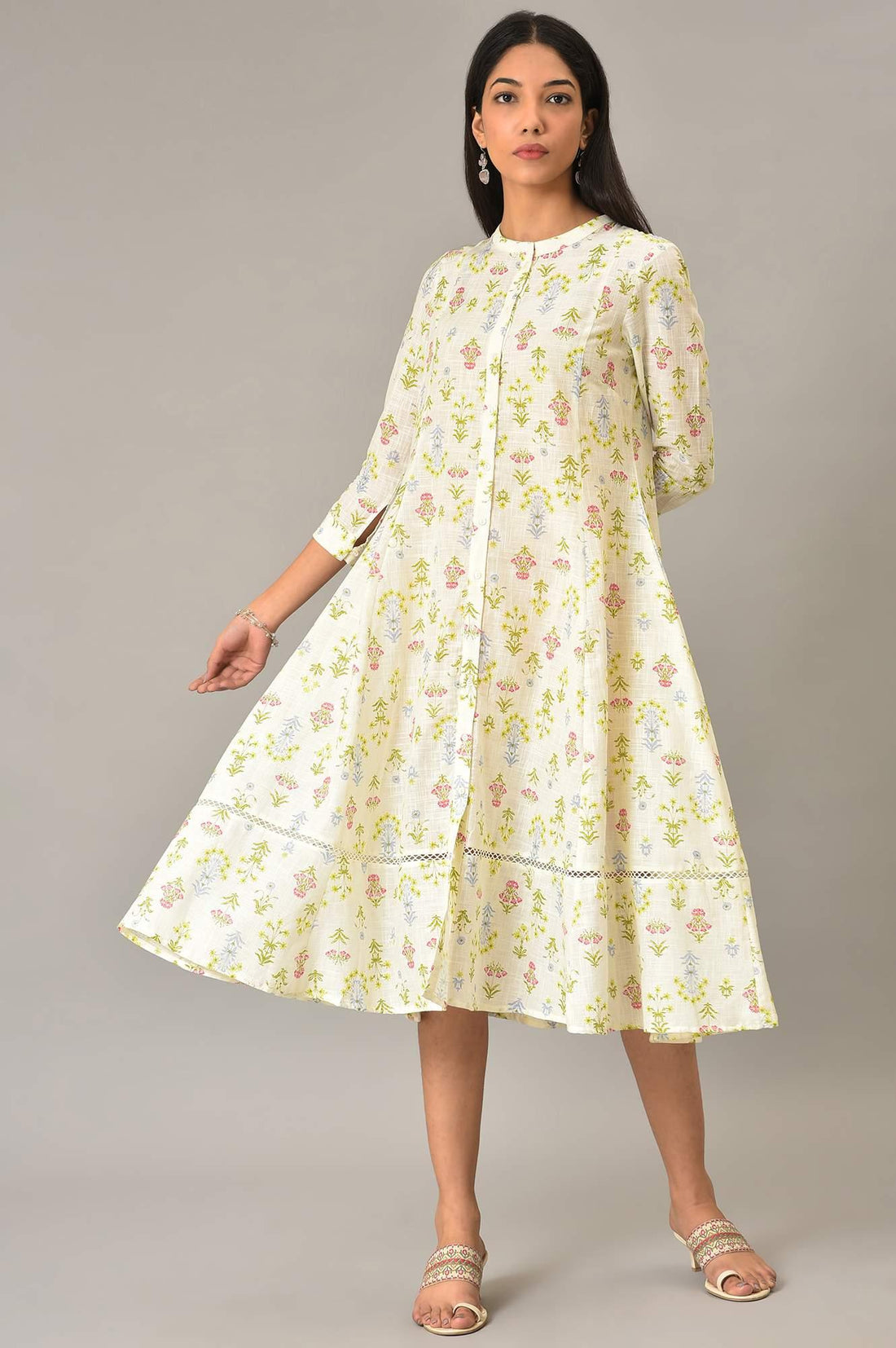 Embrace casual chic with this off-white dress designed for the modern woman. Made from 100% pure cotton, this woven garment offers both comfort and style. The dress features a band neckline and three-quarter sleeves, creating a balanced and flattering silhouette. Its a-line cut ensures a graceful drape, while the delicate floral print adds a touch of romance. Perfect for casual outings, this fusion-style dress combines the best of ethnic and contemporary fashion. The breathable cotton fabric makes it an ideal choice for various occasions, promising both comfort and elegance throughout the day. Pair it with stylish sandals to complete the look, exuding effortless elegance. Versatile and timeless, this outfit is perfect for making a statement at any occasion, day or night.