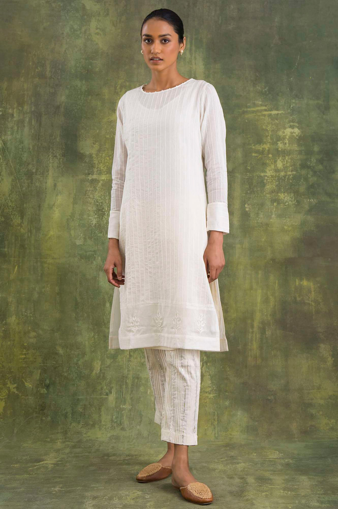 Elegant Cotton Silk kurta Featuring Tonal Aari Embroidery And Subtle Beadwork Highlights.It Includes A Matching Slip.