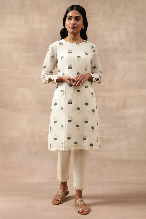 An Elegant Gold And Green All-Over Buti Jacquard kurta In Cotton Silk With Sequins Embroidery At Armhole And Unique Detail On Sleeves With Embridery. Finished With Soft Voile Lining.