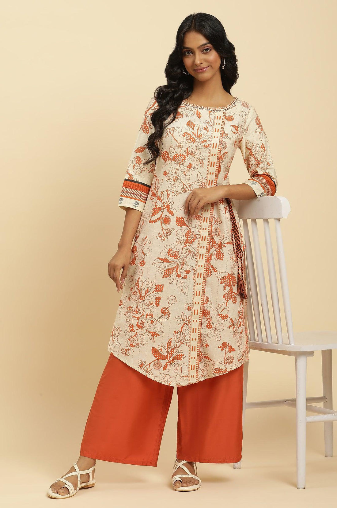 Embrace elegance and comfort with this stunning ethnic ensemble featuring a kurta and parallel pant set. Crafted from a luxurious blend of 88% cotton and 12% flax, this outfit offers breathability and a soft touch against your skin. The kurta boasts a charming floral print, adding a touch of femininity to your look. Its round neckline and three-quarter sleeves provide a classic silhouette, while the a-line cut ensures a flattering fit for all body types. The rich red hue of this outfit makes it perfect for casual outings, allowing you to stand out with grace. The woven construction technique ensures durability and a beautiful drape, making this cotton-flax blend kurta set a must-have addition to your ethnic wardrobe. Whether you're attending a family gathering or a casual day out, this ensemble promises to keep you stylish and comfortable throughout the day.