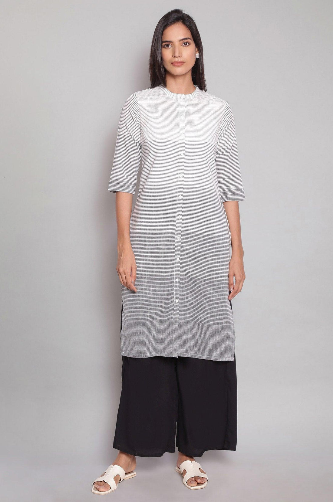 Ecru and grey coloured casual kurta in stripe print. It has mandari collar with full button placket and three-quarter sleeves.