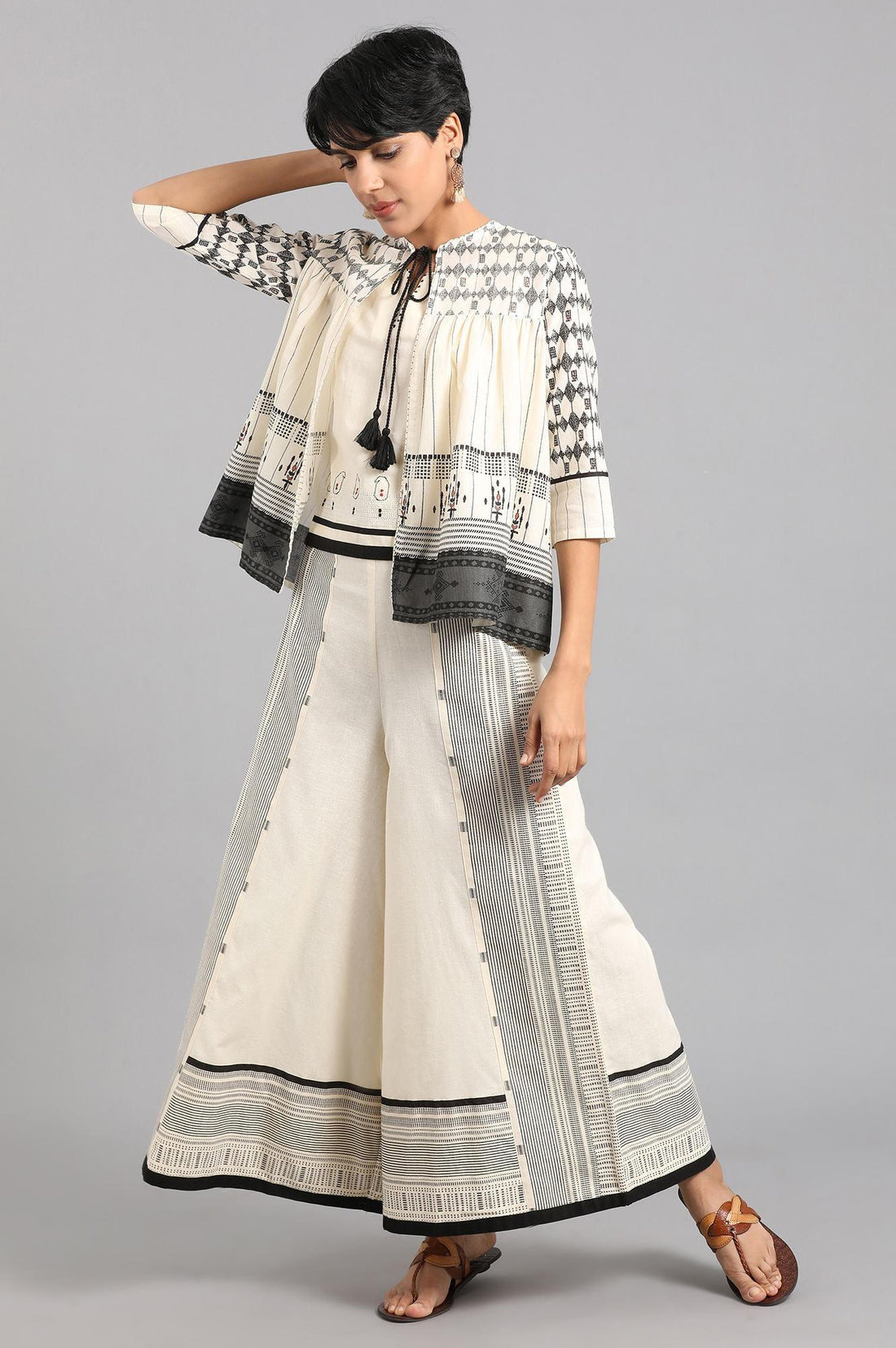 Ecru open front layered top with printed detail.