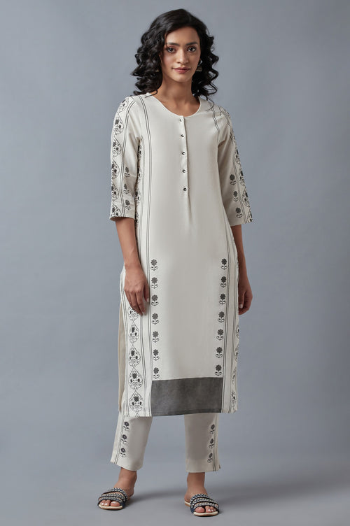 Crafted In Premium Fabric, This Ecru Straight Fit Kurta Has Floral Motifs And Round Neck With Button Closure. It Is Paired With Printed Slim Pants And Dupatta.
