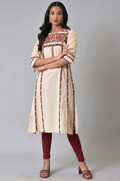 Elevate your ethnic wardrobe with this exquisite cream-colored kurta designed for women. Crafted from pure cotton, this straight-cut kurta offers both comfort and style. The tie-up neckline adds a touch of elegance, while the three-quarter sleeves provide versatility for various occasions. The geometric printed pattern enhances its visual appeal, making it perfect for elevated events. Woven with precision, this kurta embodies traditional craftsmanship with a modern twist. The 100% cotton composition ensures breathability and softness against the skin. Whether paired with palazzo pants or leggings, this kurta is a versatile addition to any woman's ethnic collection, suitable for both casual outings and special occasions.