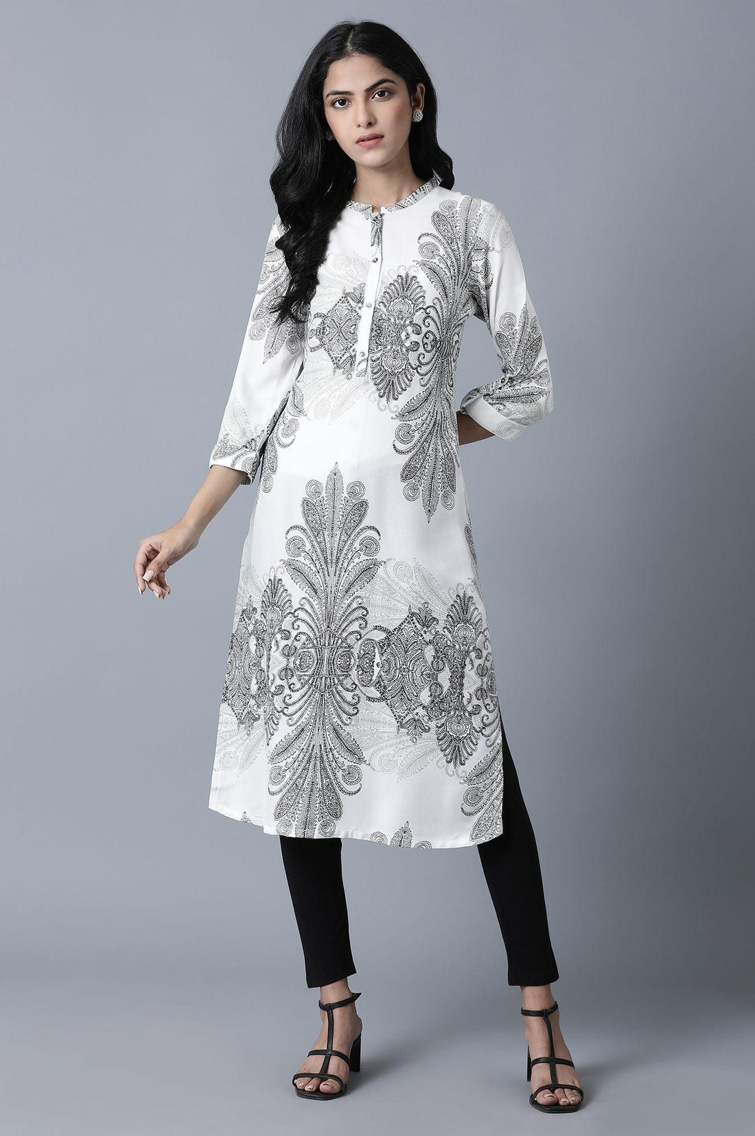 Ecru tropical print kurta in mandarin collar and rolled-up puff sleeves.