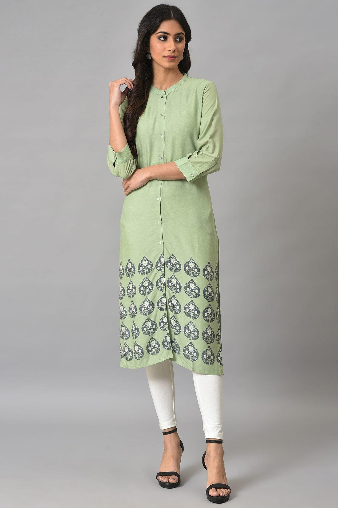Elevate your casual wardrobe with this exquisite green kurta, perfect for everyday ethnic wear. The floral printed design adds a touch of elegance to the garment, making it suitable for various casual occasions. Crafted using a woven construction technique, this kurta ensures durability and comfort. Made from 100% viscose, also known as rayon, the fabric offers a soft and breathable feel against your skin. The mandarin neckline adds a contemporary twist to the traditional silhouette, while the three-quarter sleeves provide versatility for different seasons. The straight cut of the kurta creates a flattering silhouette that complements various body types. This ethnic piece seamlessly blends style and comfort, making it an essential addition to your wardrobe for effortless, chic casual wear.