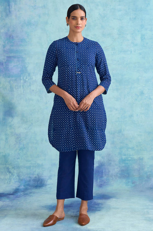 A Straight kurta In Indigo Dabu Print With Contrast Stripe Piping And Buttons With Fine Kantha Detail. Also Includes Side Pockets.