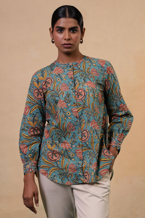 Elevate your casual style with this turquoise straight-fit top for women. Featuring a mandarin neckline and full sleeves, this pure cotton piece boasts a charming floral pattern. The slit detail adds a touch of sophistication, making it perfect for everyday wear. Its versatile design effortlessly combines comfort and fashion, ensuring you look your best while feeling at ease.