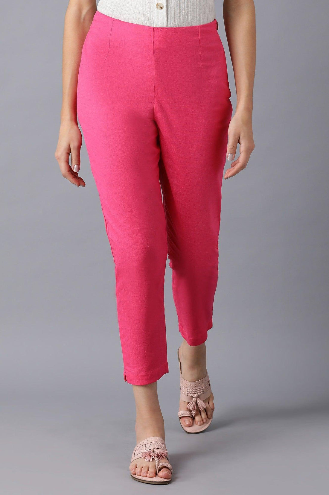 Fuchsia pink solid slim pants with side button, zip and partially elasticated waistband.