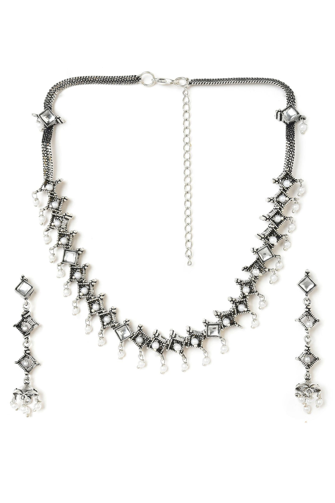 Timeless Golden Oxidised Princess Necklace Set With Detailed Pearl Work And Faux Kundans