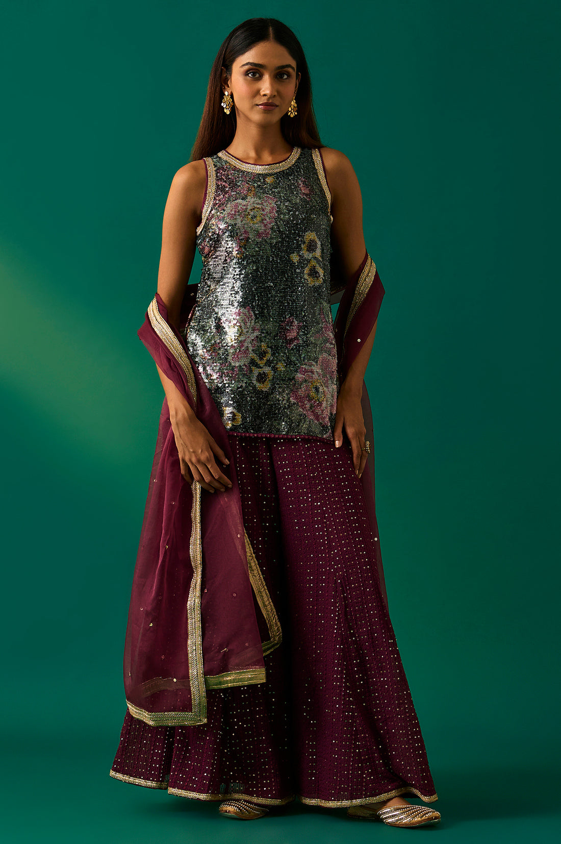 Radiate glamour with this dazzling silver sequinned kurta set for women. The sleeveless straight kurta features intricate floral embellishments and a keyhole back for a touch of elegance. Paired with a maroon sharara adorned with shimmering accents and a lightweight dupatta with golden border detailing, this ensemble is perfect for weddings, festive occasions, or evening parties. The floor-length sharara adds a regal flair, while the metallic floral pattern on the kurta ensures you shine with every step. Designed for the modern woman who loves to blend tradition with contemporary style, this set is a celebration of artistry and sophistication.