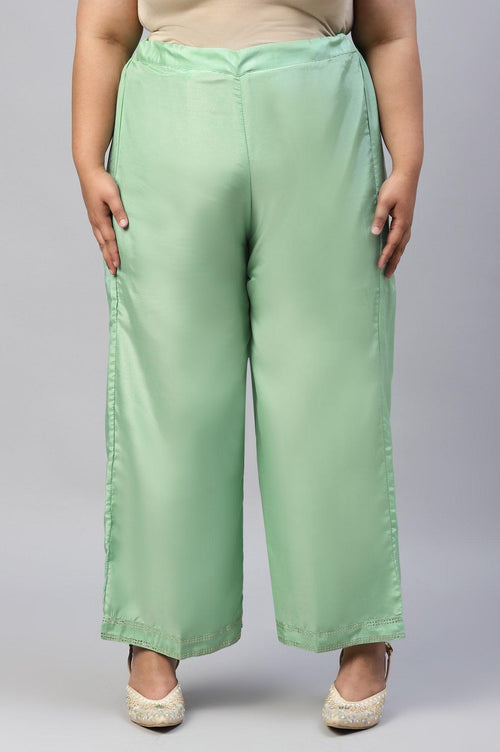 PISTACHIO GREEN MID-RISE PARALLEL PANTS WITH MUKAISH PRINTED BORDER AT HEM