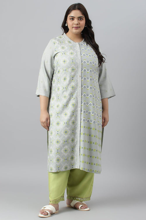 Discover the perfect blend of comfort and style with this women's woven kurta and tight set. Designed for casual occasions, this ethnic ensemble features a chic three-quarter sleeve length and a sophisticated band neckline. The geometric printed pattern adds a modern touch to the traditional silhouette, while the straight cut ensures a flattering fit. Crafted from 100% viscose rayon, this grey ethnic set offers breathability and ease of movement. The versatile design makes it an ideal choice for various casual outings, allowing you to showcase your ethnic flair with contemporary elegance. Pair it with stylish sandals to complete the look, exuding effortless elegance. Versatile and timeless, this outfit is perfect for making a statement at any occasion, day or night.