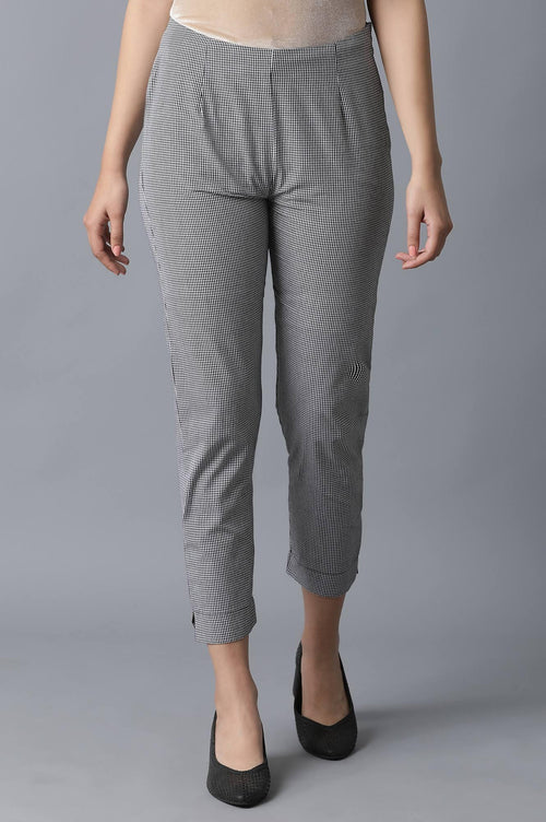 Grey striped slim pants in mid-rise, with partially elasticated waistband, zip and side button.