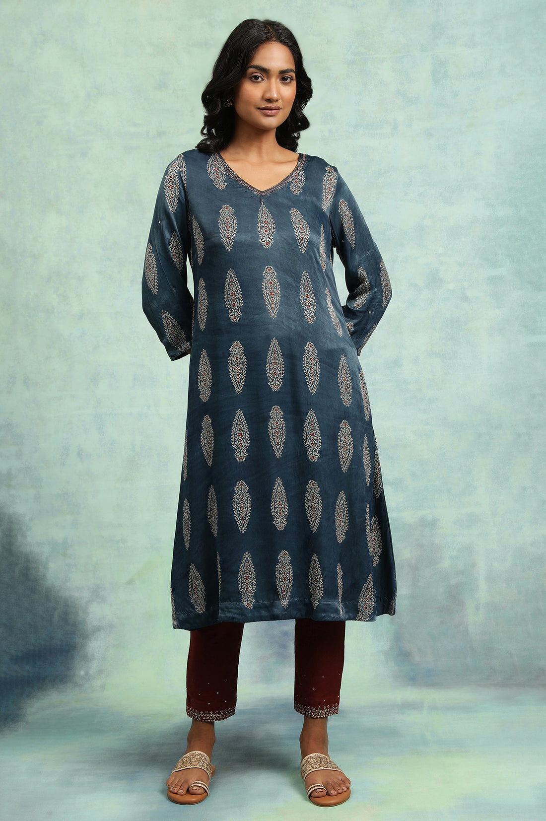 An A-Line kurta In All-Over Buti Ajrakh Print Crafted In Lustrous Modal Satin Fabric. Further Accented With Detailed Dabka Embroidery At Neck And Sleeves.