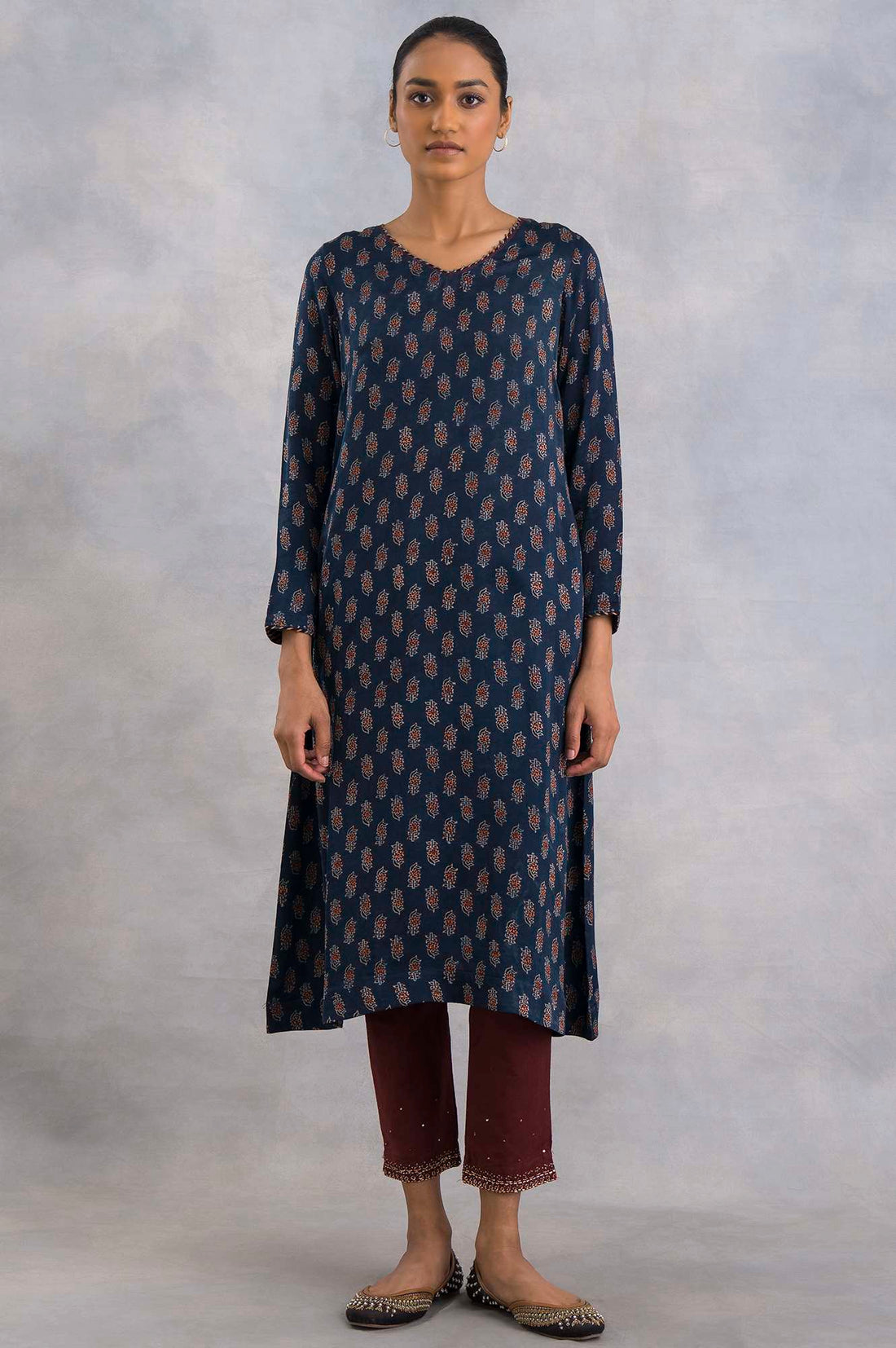 A Timeless V-Neck kurta In Ajrakh Print On Lustrous Satin, Accented With Beadwork And Stripes Piping Along The Neck And Sleeves.