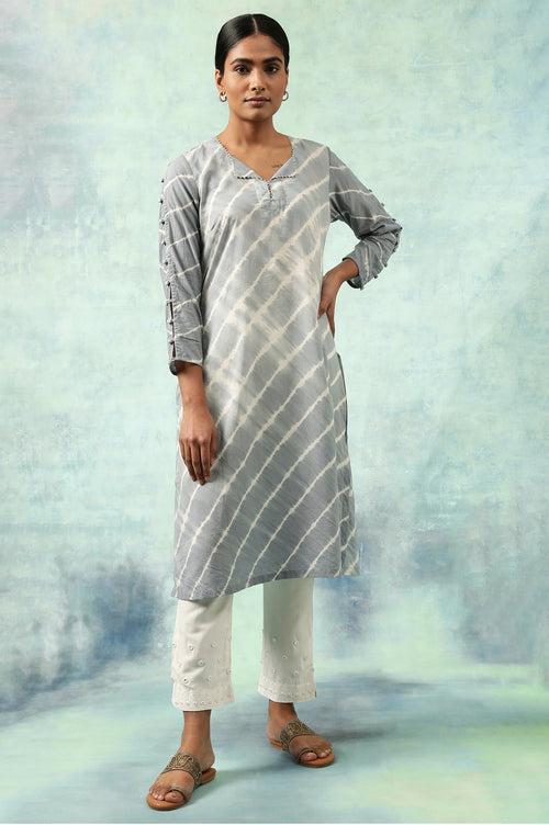A Straight Cotton Voile kurta In Lehariya Technique. Features Square Neck With Delicate Bead Work Embroidery. Further Finished With Interesting Buttoned Sleeves.