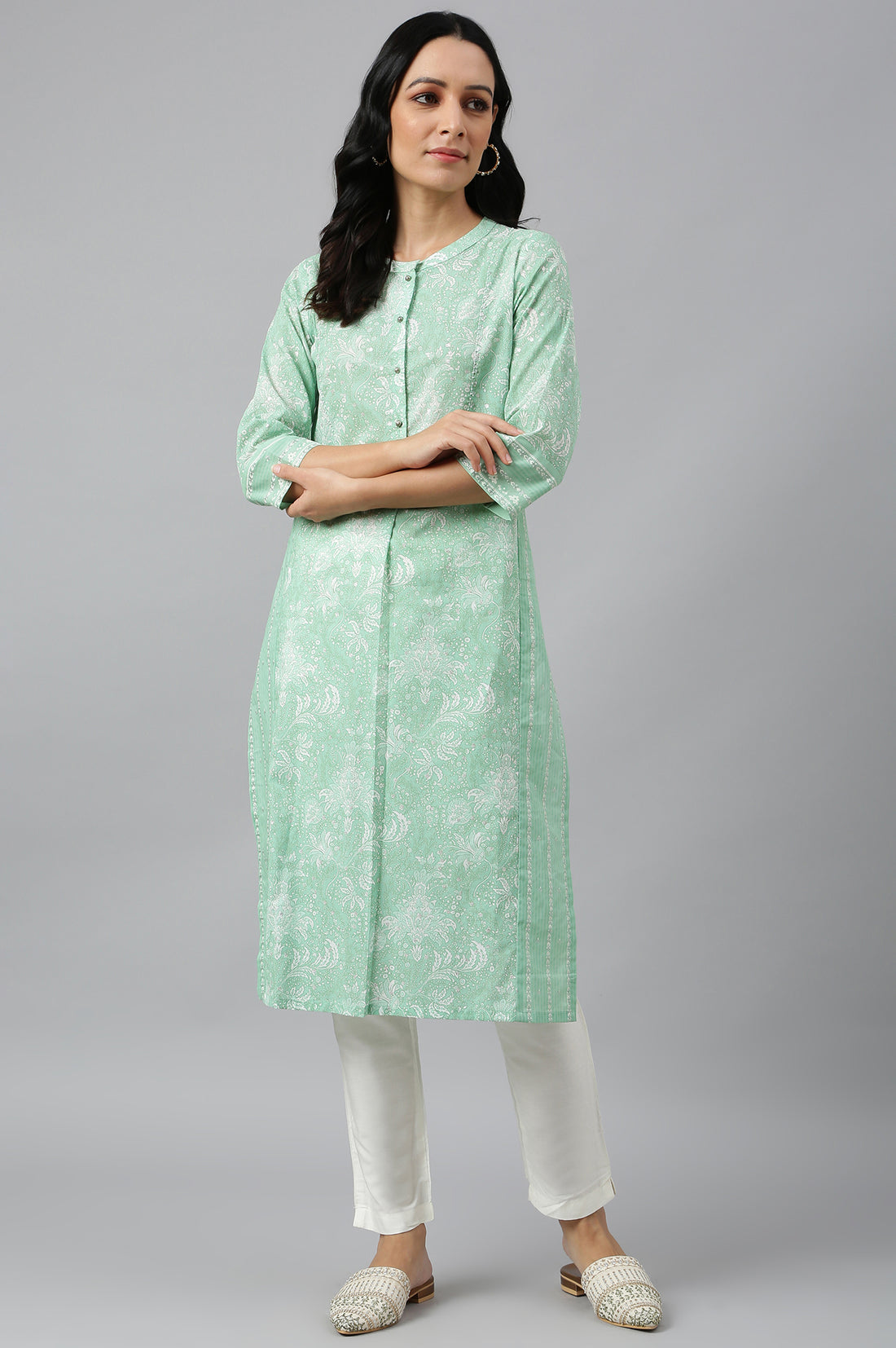Experience comfort and style with this casual green kurta, perfect for everyday wear. Made from 100% pure cotton, this ethnic piece offers breathability and softness against your skin. The straight cut silhouette flatters various body types, while the three-quarter sleeves add a touch of traditional charm. The mandarin collar lends a sophisticated look, making it suitable for both casual outings and semi-formal events. The printed design adds visual interest, elevating the overall appeal of this kurta. Crafted using a woven construction technique, this garment ensures durability and maintains its shape wear after wear. Whether you're running errands or meeting friends for a casual lunch, this versatile kurta will keep you looking effortlessly stylish and feeling comfortable throughout the day.