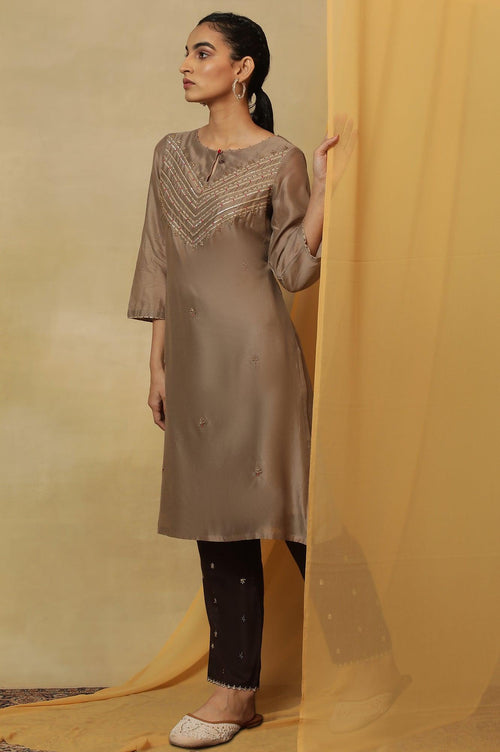 Elevate your ethnic wardrobe with this exquisite brown kurta designed for women. Crafted from a luxurious blend of 82% cotton and 18% silk, this woven piece offers both comfort and style. The three-quarter sleeves provide a perfect balance between traditional and contemporary fashion. Adorned with intricate zari and embroidery work, this straight-cut kurta exudes elegance. The keyhole neckline adds a touch of sophistication, making it ideal for elevated occasions. This new cotton silk kurta seamlessly combines traditional craftsmanship with modern design, ensuring you stand out at any event. Pair it with stylish sandals to complete the look, exuding effortless elegance. Versatile and timeless, this outfit is perfect for making a statement at any occasion, day or night.