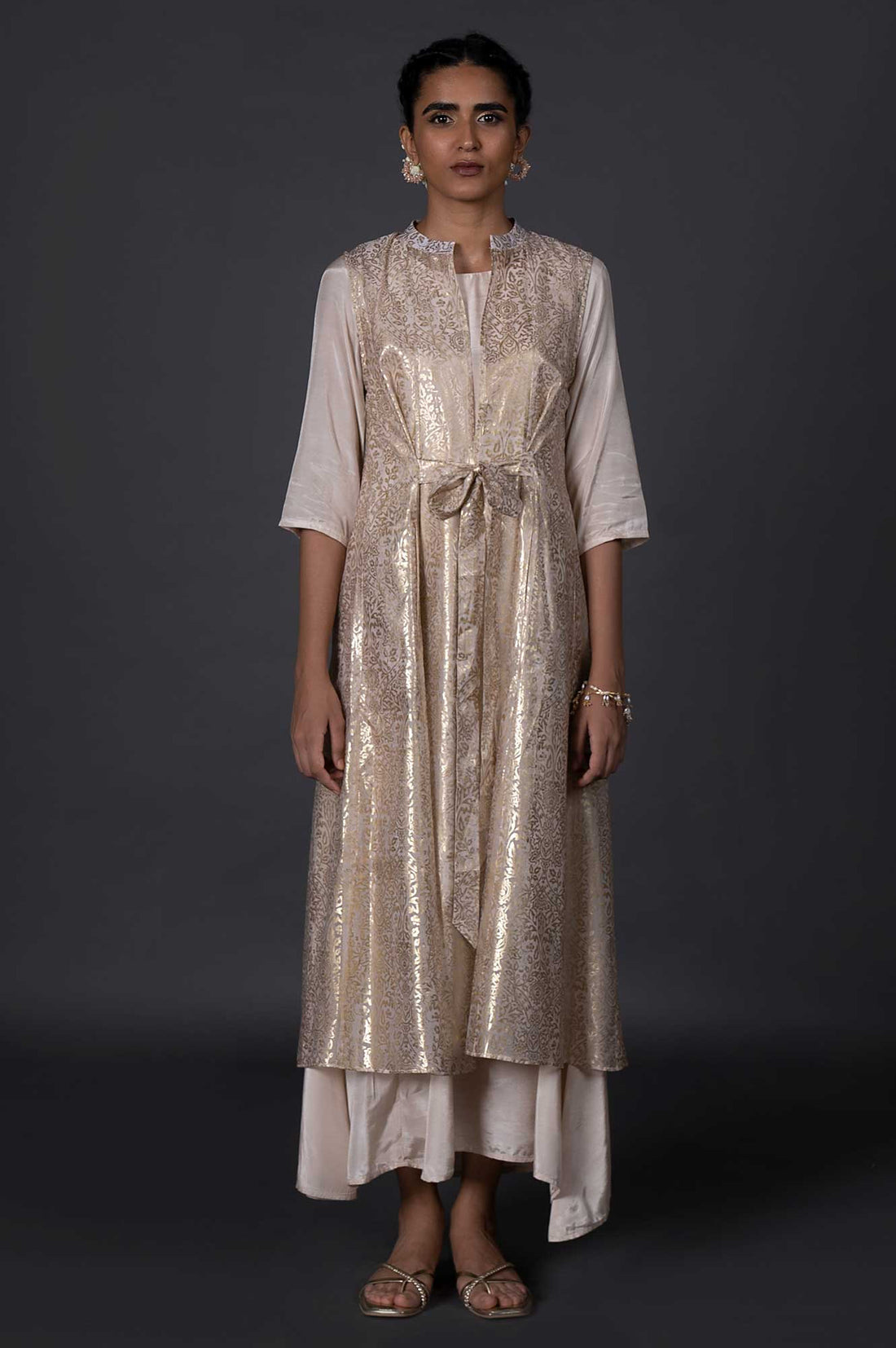 Light Pink Printed Sleeveless Organza Jacket In Kalidar Silhouette. Jacket Has Fabric Tie-Up Detail. It Is Paired With An Inner Dress With Zari Topstitch Details.