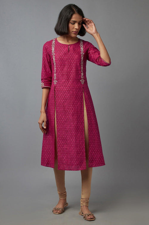 magenta kurta with front slit in keyhole neckline and three-qaurter sleeves. It also features thread embroidery and glitter print.