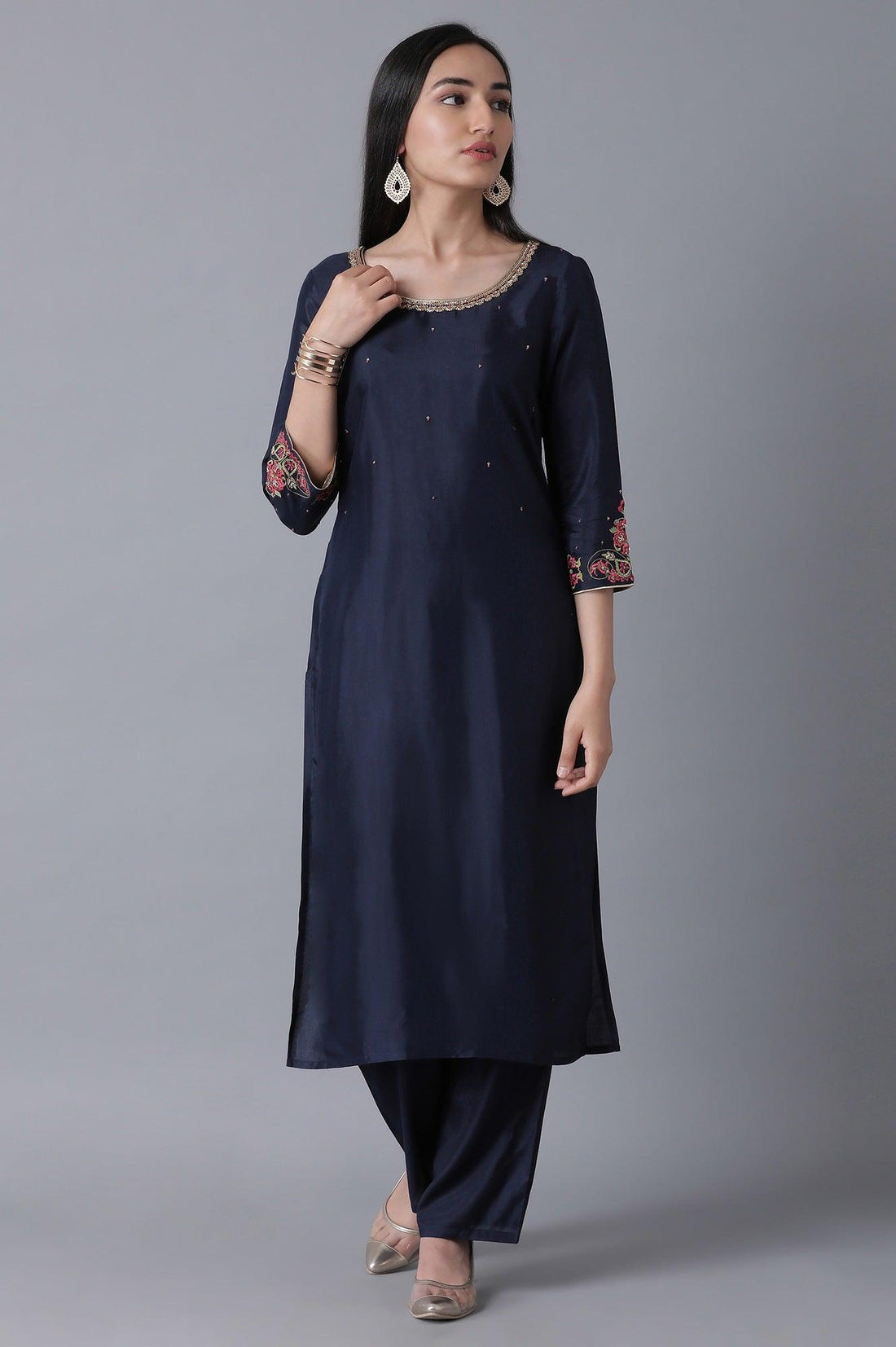 Navy blue classic kurta with embroidered3/4th sleeves and embellished round neck.