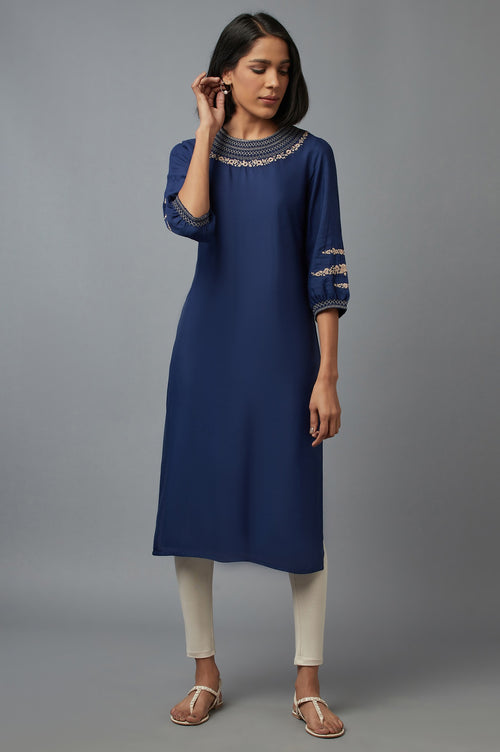 Elevate your casual wardrobe with this exquisite ethnic kurta, crafted from a luxurious blend of 88% rayon and 12% flax. The blue hue serves as a captivating canvas for the delicate floral print, adding a touch of natural beauty to your ensemble. The three-quarter sleeve length offers versatility, making it suitable for various seasons and occasions. The round neckline provides a classic and flattering silhouette, while the straight cut ensures a comfortable and flattering fit for all body types. This woven kurta seamlessly combines traditional craftsmanship with modern design, making it a perfect choice for those who appreciate both style and comfort in their ethnic wear. Whether you're attending a casual gathering or running errands, this kurta will keep you looking effortlessly chic and put-together.