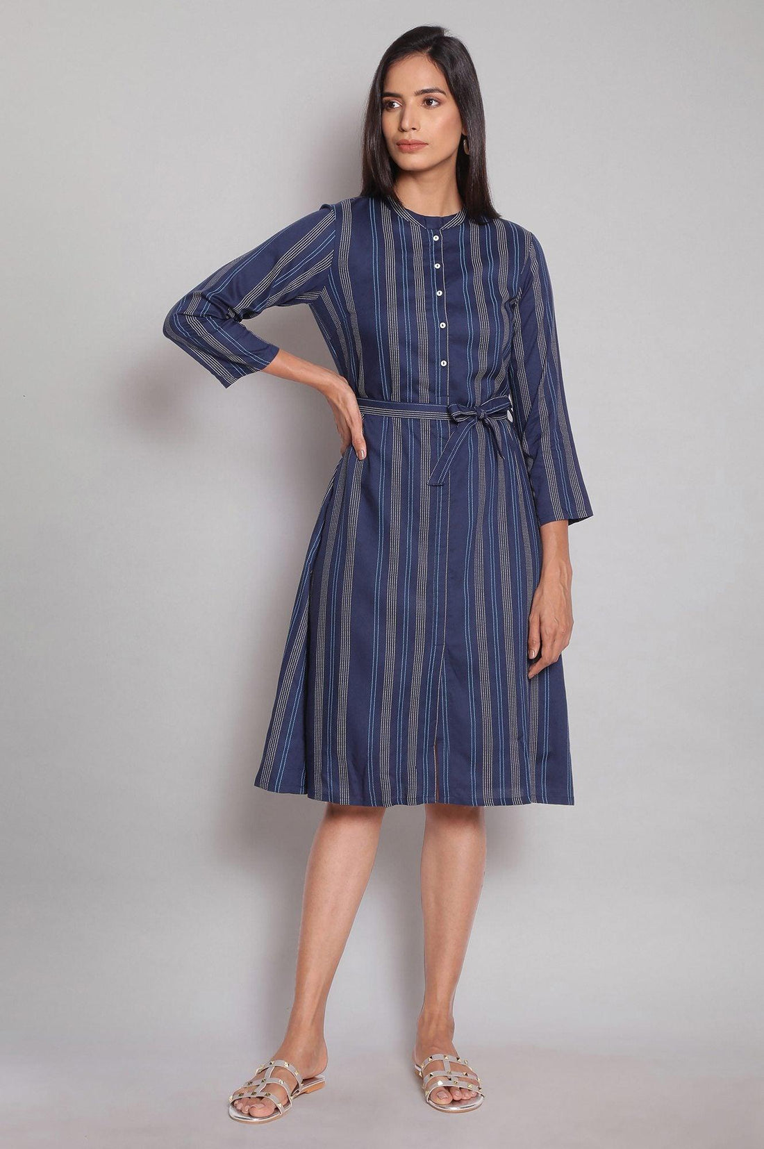 Navy blue stripe print shirt dress with belt in mandarin collar and three-quarter sleeves.