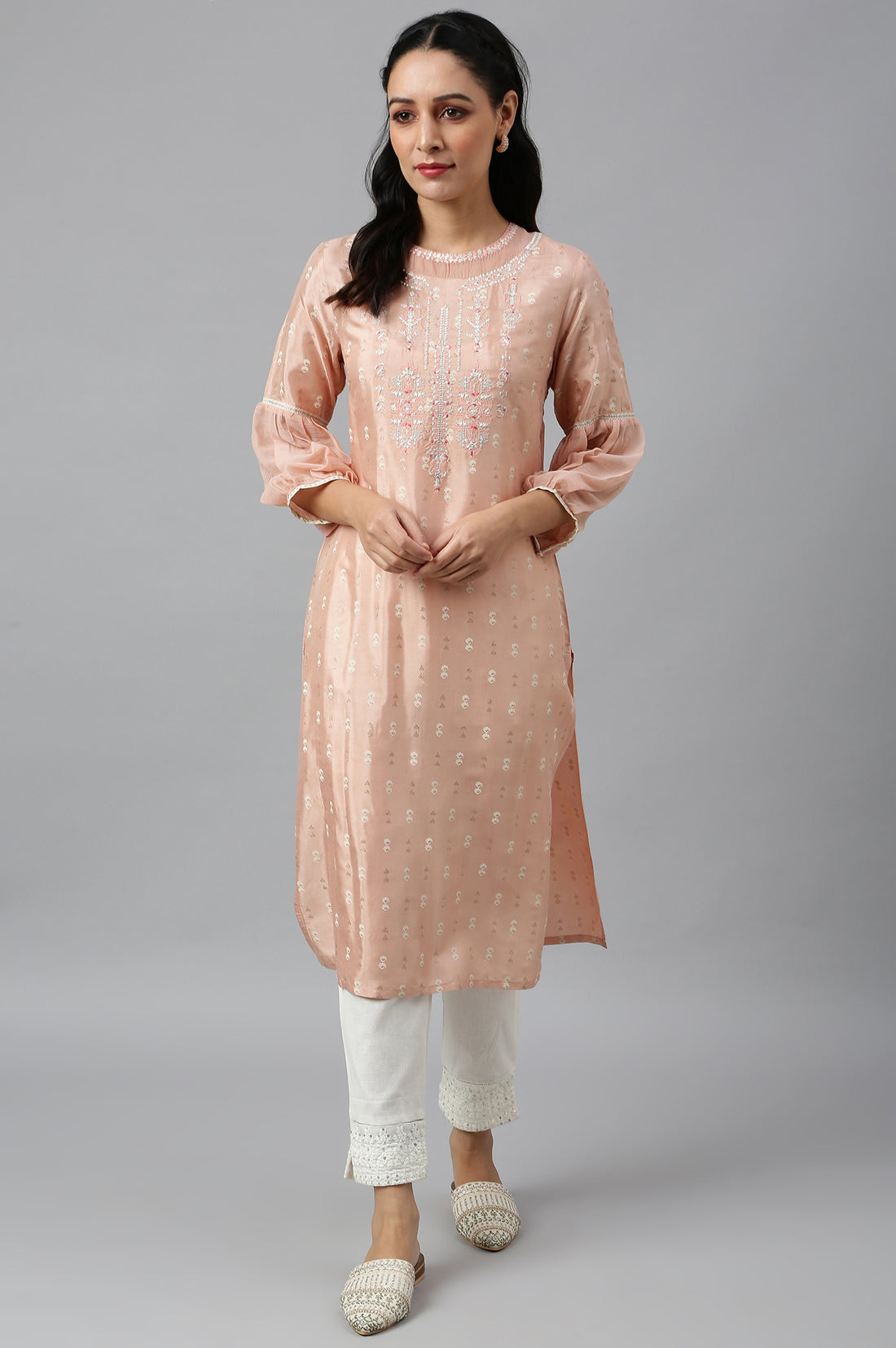 Make a statement at your next special occasion with this exquisite orange kurta. Crafted from luxurious shantung fabric, this ethnic piece boasts a stunning embroidered design that adds a touch of elegance and sophistication. The round neckline and three-quarter sleeves create a balanced and flattering silhouette, while the straight cut ensures a comfortable fit. The woven construction technique speaks to the garment's quality and durability. Made from 100% viscose, this kurta offers a silky smooth feel and a subtle sheen that catches the light beautifully. Perfect for weddings, festivals, or any event where you want to stand out, this embroidered kurta combines traditional craftsmanship with contemporary style, making it a versatile addition to your ethnic wear collection.