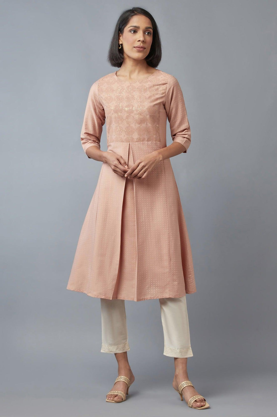 Glam Up Your Wardrobe With This Tuscany Pink A-Line kurta. Crafted In Premium Fabric, This Light Festive kurta Has Polka Dot Print And Features Sequin Work On Yoke. It Is Paired With Ecru Slim Pants.