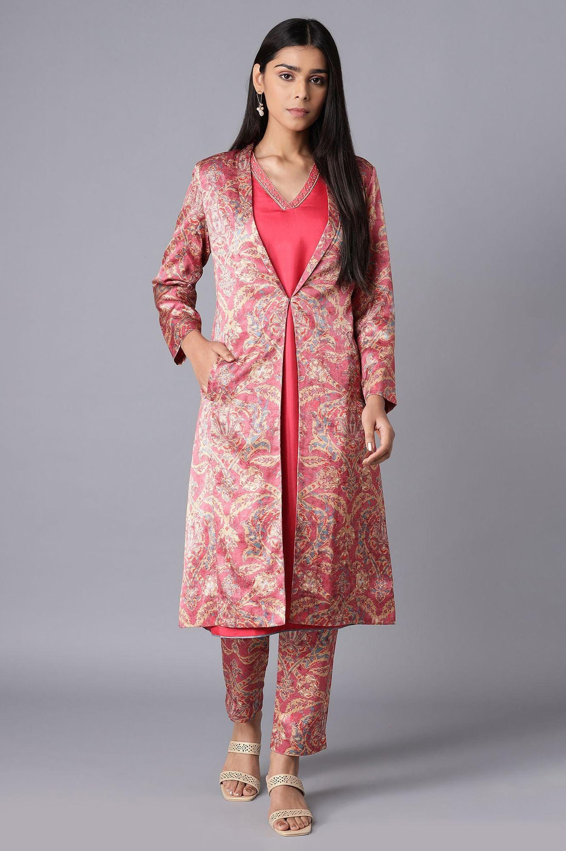 Let your outfit be a conversation starter by donning this power packed Pant Suit set. Crafted in Mashroo Silk, this 3 piece pant suit with shantung kurta is a sure deal to steal all the limelight this festive season. Set consist a sleek inner kurta in straight silhouette and features V-neck with embelishment on neckline and sleeves hem. It is paired with a quirky jacket in full-sleeves and matching slim pant. The stunning print pattern and the fusion style ensures you exude a royal and regal vibe.