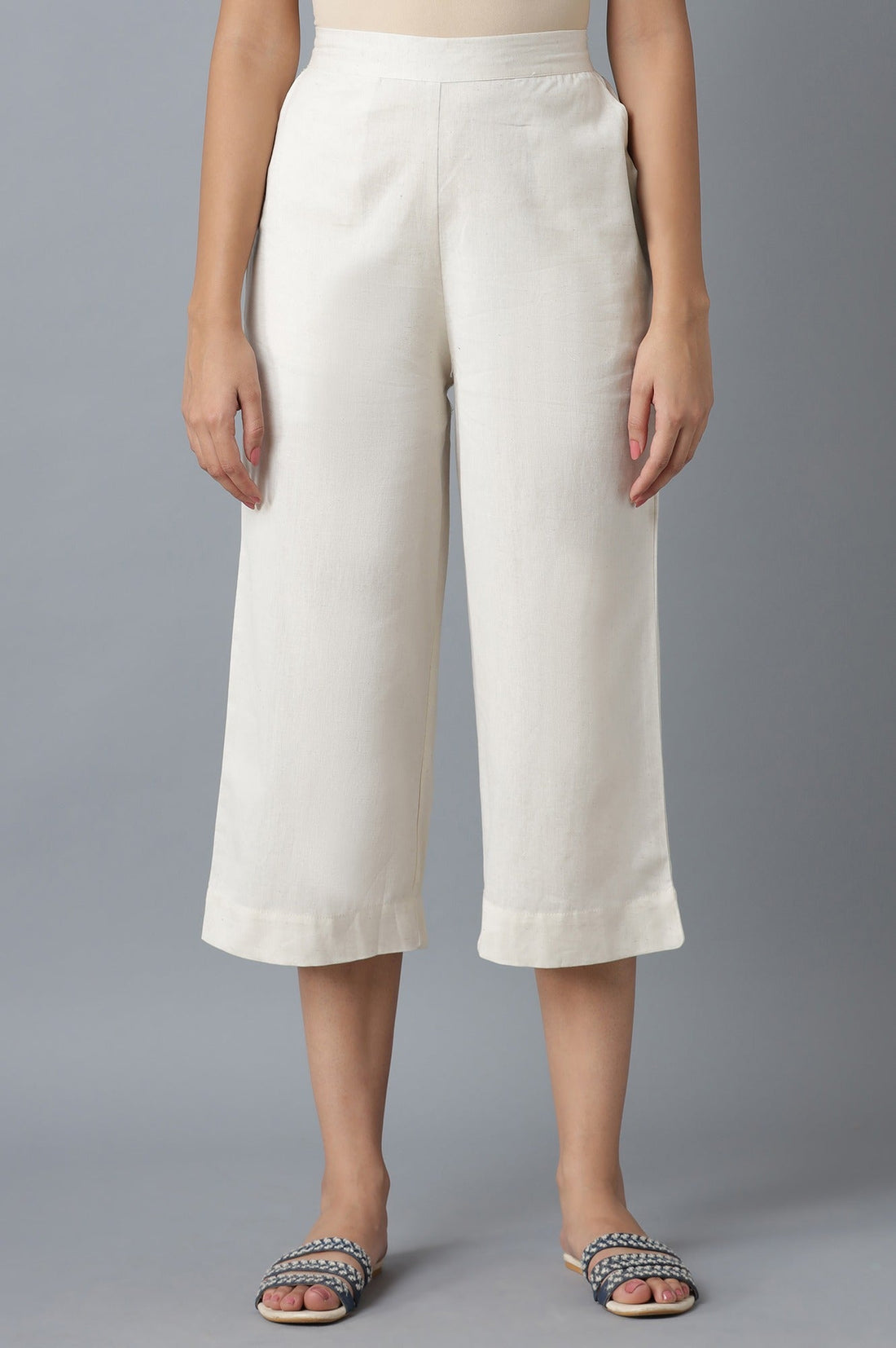 Crafted for effortless elegance, these off-white culottes feature a mid-rise waist and a partially elasticated back for a comfortable yet tailored fit. The woven cotton-flax blend fabric offers a soft texture and breathable comfort, making it ideal for casual outings or relaxed gatherings. Designed with two functional side pockets, these calf-length culottes combine practicality with style. Pair them with a chic top or kurta to create a versatile look that transitions seamlessly from day to evening.
