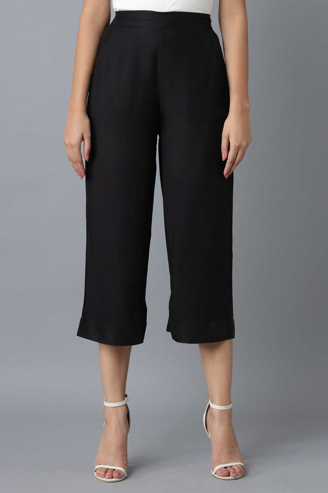 Get a classy look in this calf length black culottes. It has midrise and partially elasticated waist that gives a perfect fit. The solid culottes also has 2-side pockets.