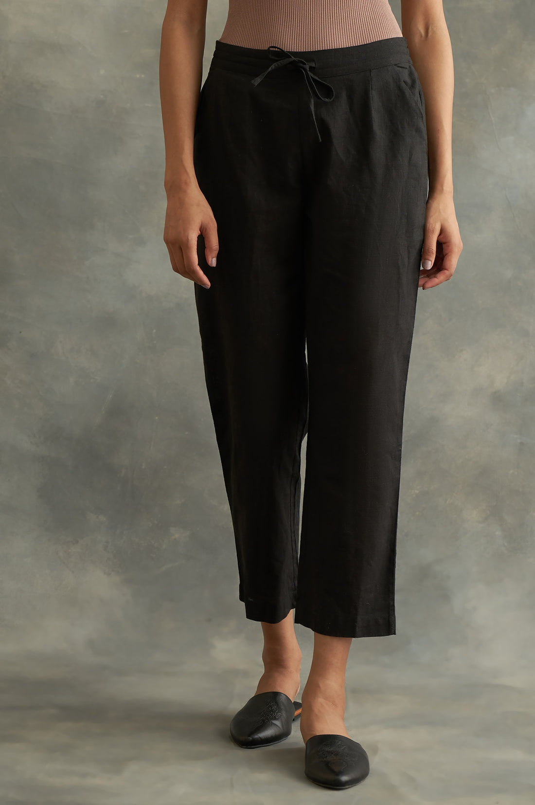 Black Solid Straight Pants With Two Pockets And Drawstrings.