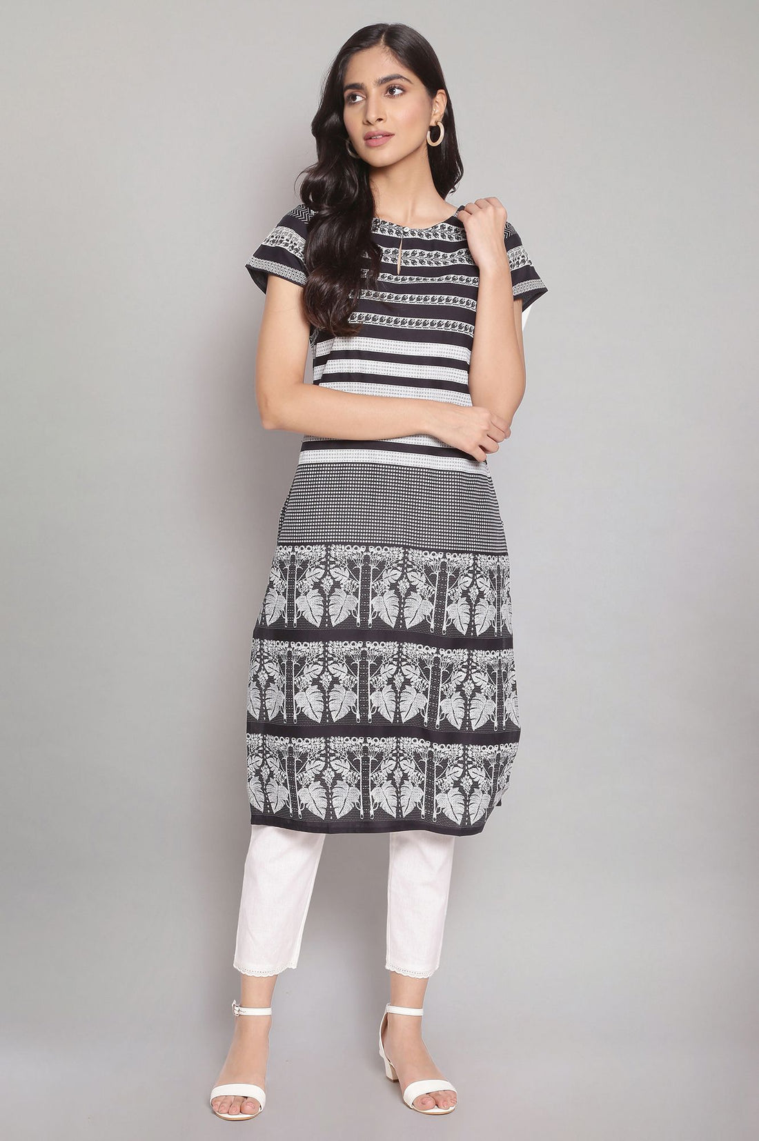 Black coloured woven striped straight kurta that has a round neck key hole neckline with button and cap sleeves.