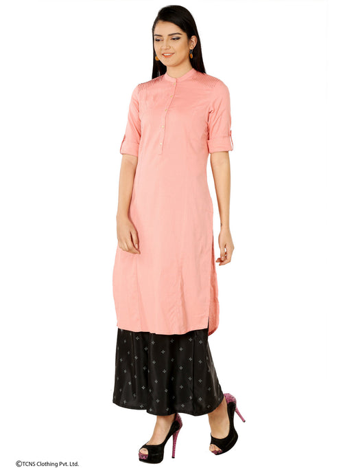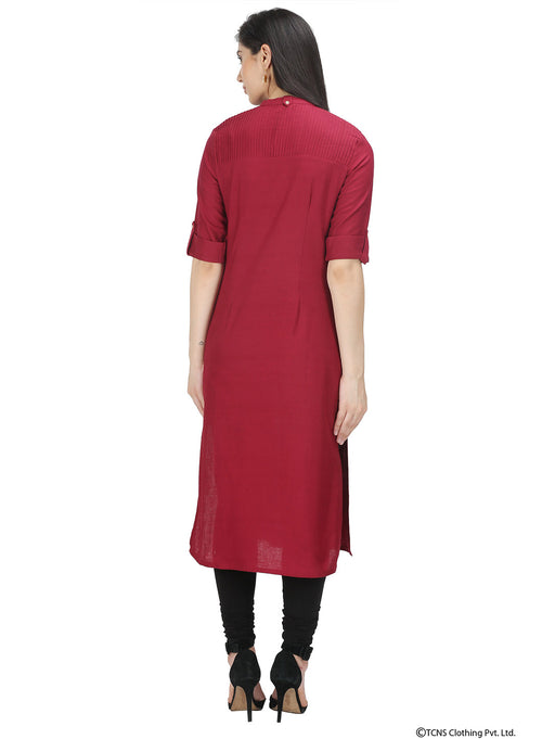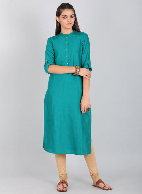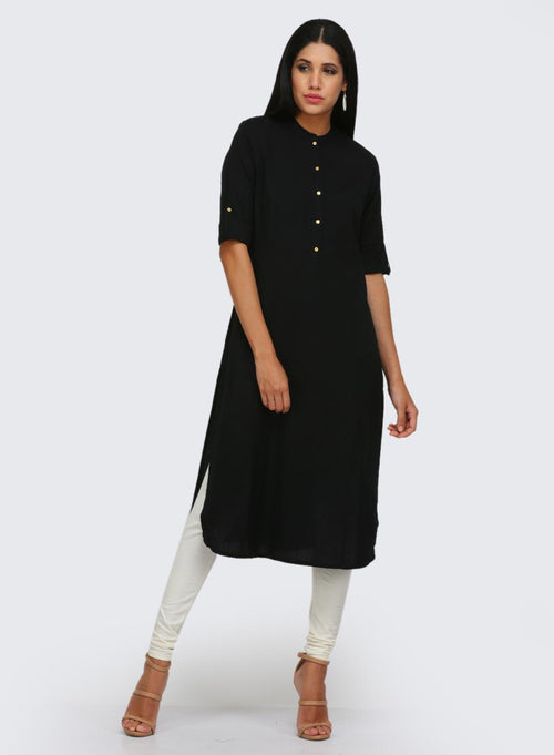 This navy blue mandarin neck 3/4 sleeve kurta has a short front button placket, roll-up tab feature, side slits and pintuck detail.